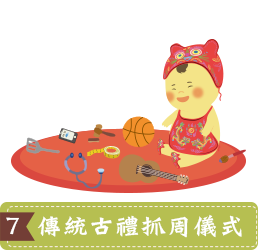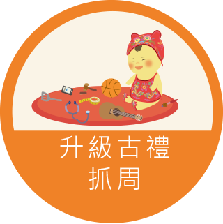 抓周,也叫試兒、試周。是每位寶貝人生中第一個重要儀式,因時代變遷,將抓周物品配合現今社會的職業,取十二樣代表不同職業的物品,寓意六六大順,來預測紅嬰仔未來職業或性向。