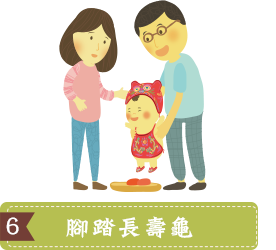 「一視二聽三抬頭,四握五抓六翻身,七坐八爬九發牙,十捏周歲獨站穩。」紅嬰仔出生滿週歲,古稱「度晬ㄗㄨㄟˋ」,當天外公外婆及親友送來賀禮,家裡準備牲禮、紅龜粿、雞酒祭拜神明祖先後,將紅龜粿送給親友分享喜悅。接著透過抓周禮俗慶祝紅嬰仔的第一個生日,首先讓紅嬰仔腳踩紅麵龜象徵健康長大、長命百歲,然後準備十二樣象徵不同行業的物品放置在米篩內,讓紅嬰仔從中抓取三物,此物特徵用來預測紅嬰仔未來職業或性向,同時也希望寶寶未來的成長過程都可以平平安安、順順利利。